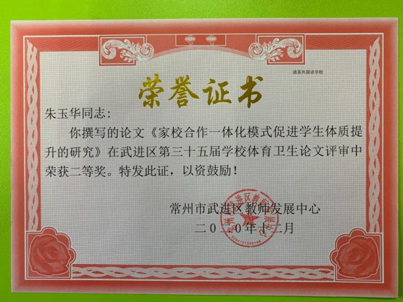 ,朱玉华老师撰写的论文《家校合作一体化模式促进学生体质提升的研究》在