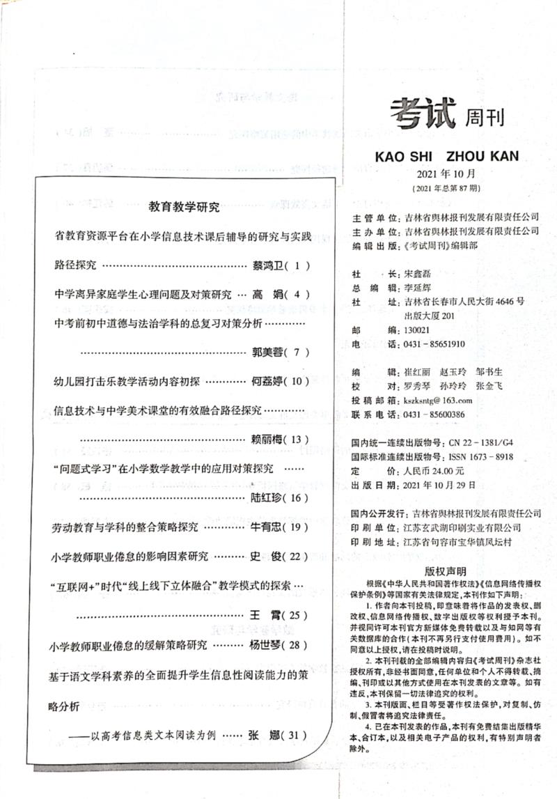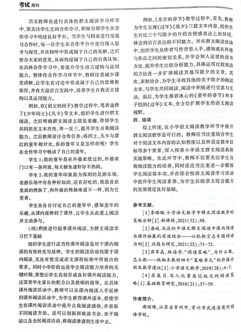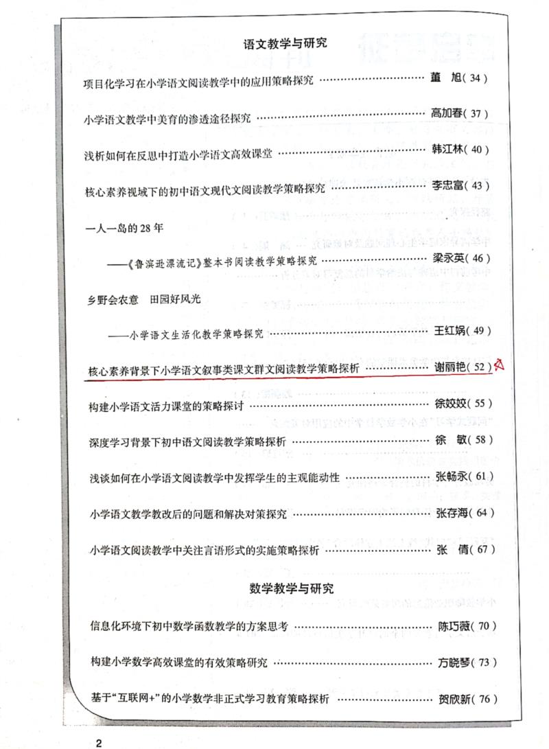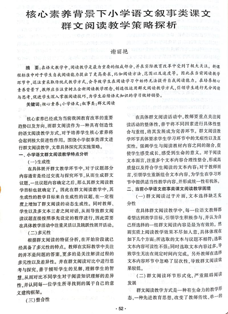谢丽艳老师论文《核心素养背景下小学语文叙事类课文群文阅读教学策略探析》发表省级刊物