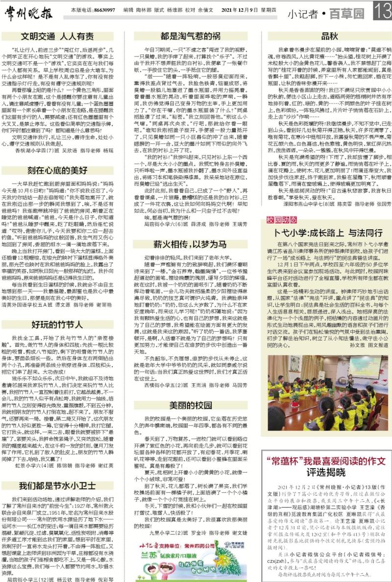 谢丽艳老师指导谭文源《刻在心里的美好》发表《常州晚报》