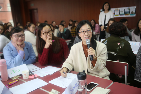 Christ从“什么是阅读?为什么要阅读?如何进行有效阅读?阅读什么?”四个哲学辩证的角度全方位地阐释了如何开展适合儿童的英语阅读。深入浅出的讲解,生动形象的示范,有理论的指导,更有案例的分享,让与会教师在学生、教师、家长的多重身份间自由切换。作为学生,教师们在导师的引导下进行思考、讨论、分享活动,收获了“Reading quickly, Enjoyable with Adequate comprehension, so they Don’t need a dictionary.”这一阅读概念的界定,刷新了对阅读定义的认识; 作为教师,在导师的引导下思考“鼓励学生阅读的方法”,为科学指导儿童进行英语阅读进行思维众筹,积蓄更多智慧方法;作为家长,导师幽默的一人多角色表演,使我们深刻体会到言传身教的重要性,亲子共读是激发儿童阅读兴趣最重要的策略。