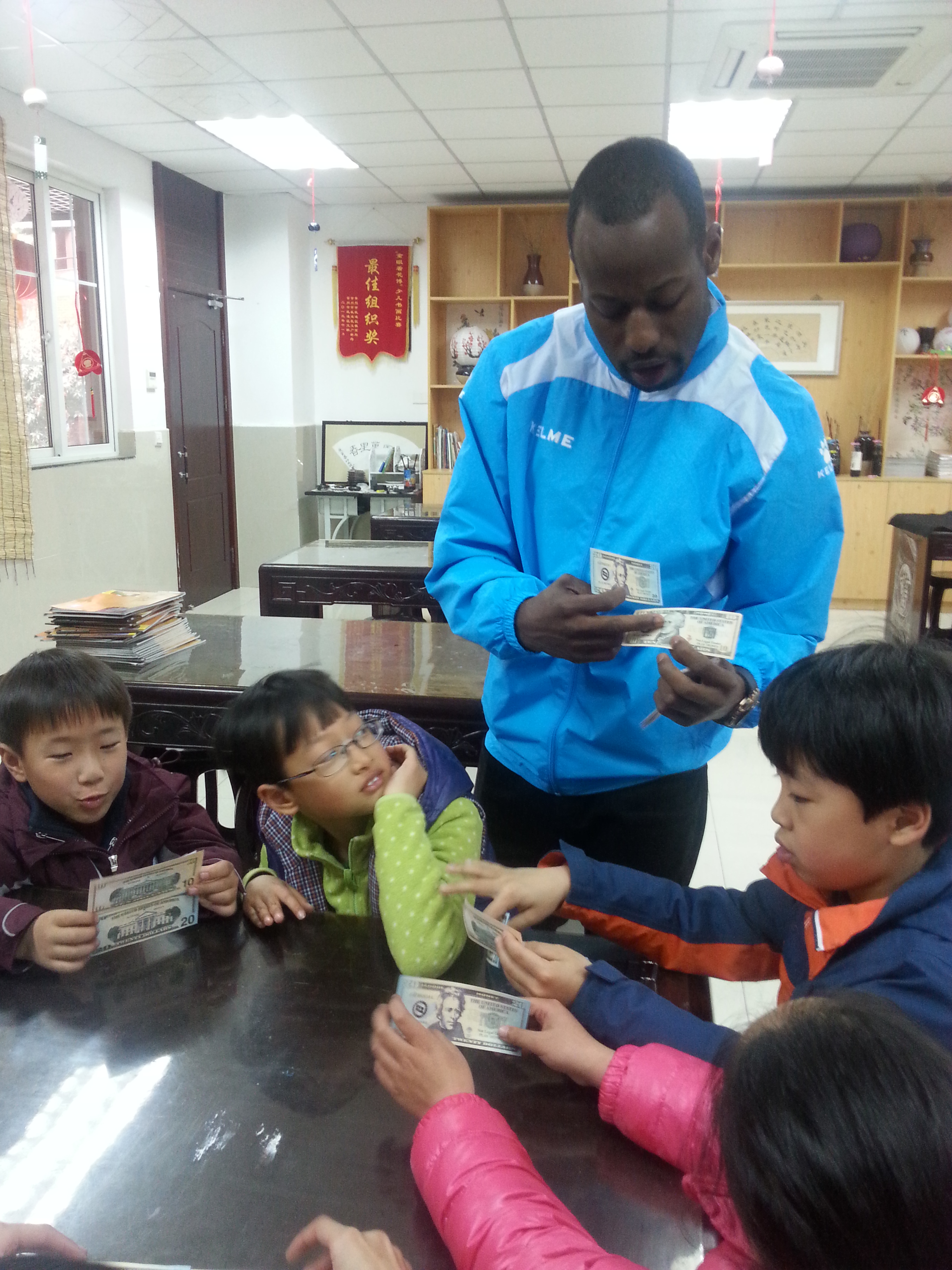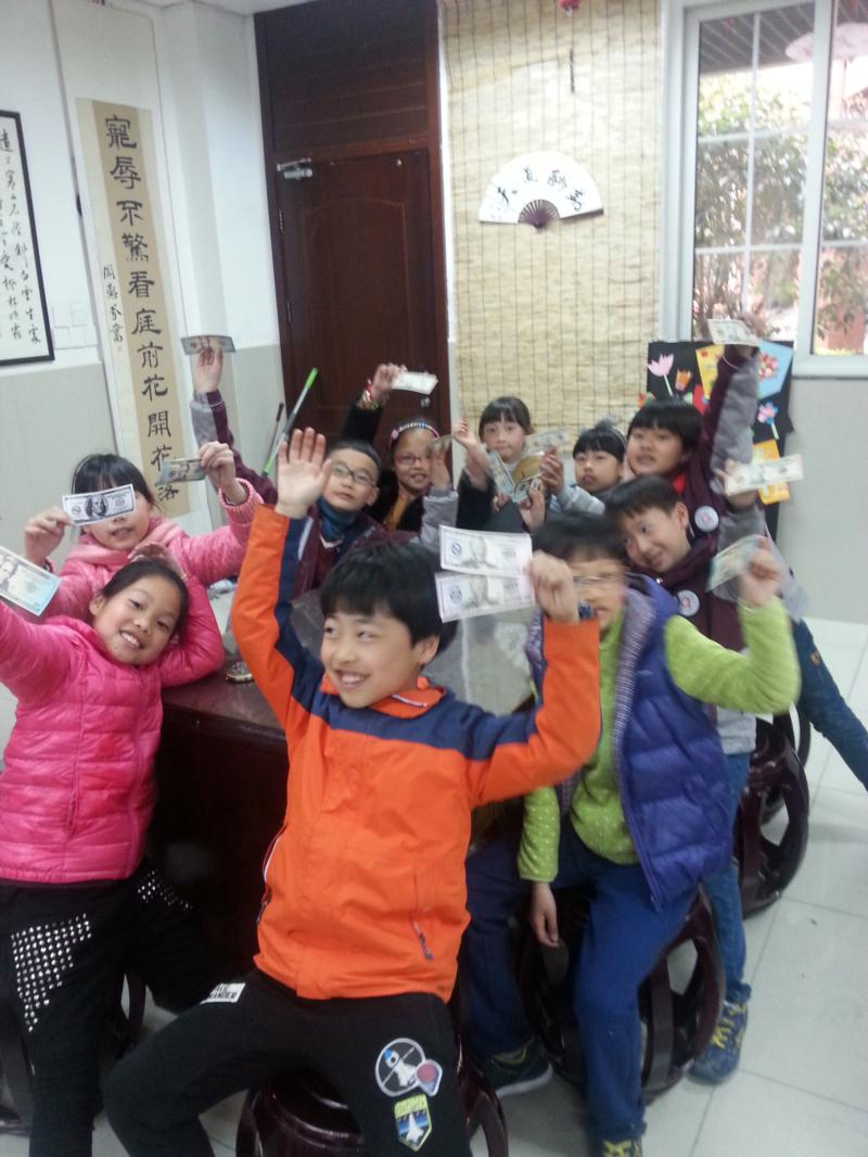 本次的快乐英语角增添了一个新版块:认识美元。Perry老师让每个孩子触摸感受各种面值的美元货币,介绍美元的外观,面值差异,还不时和人民币作比较,孩子们听得聚精会神,好奇地不时向老师提问:美元的和人民币的汇率是多少?美元很重要吗?100美元能买什么?老师也一一给了详细的解答。除此以外,外教Perry还给孩子们介绍了美元纸币上的总统头像的知识,展开了丰富的历史画卷和背景故事,让孩子们又多了一份收获。