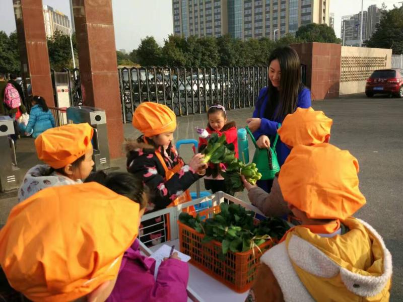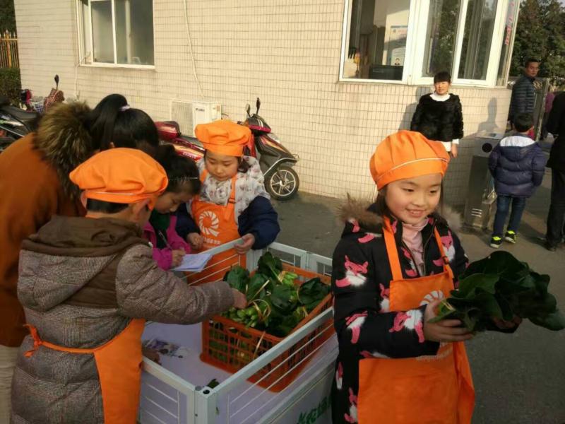 “挖菜——闻一闻泥土的芳香,运菜——给蔬菜称一称重量,择菜——为青菜选件衣裳,洗菜——来一个温水澡给青菜,捆菜——为青菜扎上辫子,卖菜——为青菜安上新家”。走进阿福童农场,茂盛鲜嫩的青菜把田地遮得严严实实,农民伯伯王老师向挖菜团队介绍了青菜的习性、挖菜技巧和注意事项,孩子们一个一个围在青菜旁小心的将青菜慢慢拔起,泥土的芳香伴着青菜的清香。挖完满满一箩筐青菜后,运菜团队 6人手把手抬起装着满满一箩筐的青菜,齐心协力地喊着“一二一二”的口号把青菜运往自己的甜蜜菜园,运菜的路上引来众多村民的鼓劲和称赞。当运菜团队把青菜转交到择菜团队的桌子上时,择菜团队的孩子们小心翼翼地拿出青菜,轻轻的剥去泥土、减掉菜根,并一丝不苟仔细检查菜叶,保质保量。而洗菜团队把青菜放在早已准备好的水盆里,将青菜全身上下清洗个干净,送到捆菜团中时,团队成员先是对青菜数量和品质严格检查了一遍,保质保量,严格把关,再把菜牢牢的捆绑起来。终于等到3点钟放学后,孩子们推着甜蜜菜园小推车来到学校东门,或接待,或介绍,或算账,或记账都像一个个熟练的小菜农似得,短短40分钟就卖了97元钱。