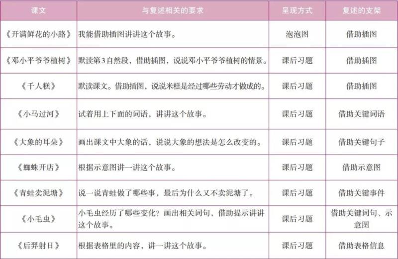 这样的编排充分尊重学生的思维特点,使学生在系统的训练中既学习到讲故事的多种方法,也得到了能力提升,为中高年级的详细复述、简要复述、创造性复述奠定坚实的基础。