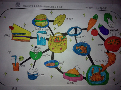 思维导图又叫心智图,是表达发散性思维的有效的图形思维工具 ,它简单却又极其有效,是一种革命性的思维工具。学生可以利用思维导图来进行词汇复习。在思维导图的绘制过程中,有的学生选择类别单词为中心主题,发散出同类单词等多个关节点,比如,中心主题是“food”,而关节点就是“sandwich”、“salad”、“hamburger”……有的学生选择字母作为中心主题,发散出很多以中心字母开头的单词,如中心点是“t”,发散出的单词就是“there”、“thirsty”、“tired”……有的学生将思维导图的主题图画成了切合主题的动物形状,还有的学生将一整册书的内容都融入到思维导图中,为自己的复习列出了清晰的脉络。
