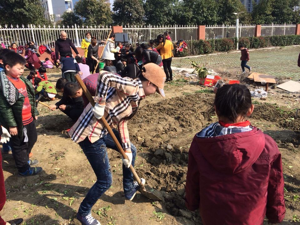 清英外国语学校的家长朋友们一直就很给力,本次种植活动也得到了他们的大力支持,爸爸们放下了繁忙的工作扛起了锄头,妈妈们穿上了胶鞋拿起了铁锹,他们的目的只有一个就是不仅让孩子们体验农作的乐趣,更要让他们明白播种的不易,要珍惜粮食,保护环境。在种植的过程中,有的小孩坚持不住了,这时陈默涵小朋友的妈妈说孩子们做事要有恒心,不能半途而废,只要做了即使遇到再大困难也要做完,就这样在父母的相互鼓励下不一会而一棵棵小树苗在清英阿福童的小农场傲然挺立。