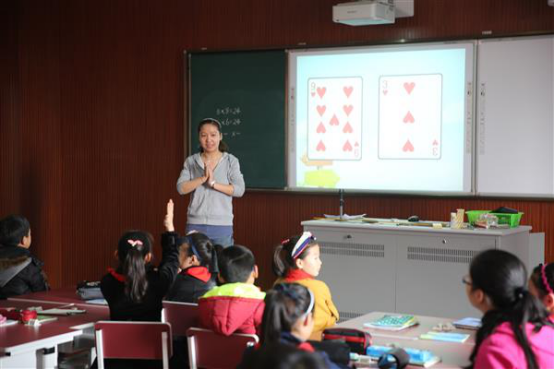 本次活动中刘晓春老师执教了一节《巧算24点》,在教学中刘老师从深受小朋友们喜爱和熟悉的扑克牌入手,引出本课的学习内容,从而创设情境,达到激发学生学习兴趣。再通过介绍扑克牌与时间相关知识,使他们感受到数学与现实生活的联系,起到拓展学生的知识面。不仅学会巧算24点,而且融会贯通也学到了很多生活常识。整节课的设计中学习方式、练习设计变化多样吸引孩子们的注意力与兴趣点,都让绝大多数的学生积极参与着课堂。