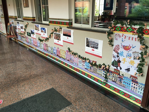 走进清英的教学楼,就仿佛来到了地球村,步移景换。这里的布置有泰国林立的庙宇;有沙特阿拉伯的骆驼;有马尔代夫的旅游盛景……这里的教室内景也许是黄沙散漫,大漠孤烟;也许是湛蓝深邃,浩淼大海;也许是冰封冻土,白雪皑皑……这里的教室外墙可能是花团锦簇,可能是绿色成荫,可能是热情四射……这里充满了异域风情,不同国家的文化民俗在这里和谐交融。