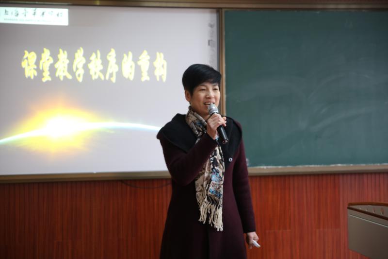 “教育就是唤醒与陪伴”,周玉薇校长在讲座中如是说,她结合金苹果双语学校的发展历史给与会老师介绍了金苹果课改的历程。她指出,随着时代的发展,金苹果学校越来越意识到课改的重要性,曾多次外出取经,并结合本校实际,逐渐摸索出了新课堂模式。“2Z3H唤醒课堂”主要是以导学案为载体,主要包括自主学习、自动建构、趋同优化、探究深化、提升内化五个环节。这五个循环递进的环节实际是一个学生提出问题、解决问题、提出和解决深层次问题、用问题创新问题的思维递进过程。唤醒课堂的目标是使学生学会主动发现问题、提出问题、聚焦问题,学会独立思考问题、合作探究问题、归纳创新问题;教育目标则是帮助学生会养成自主学习、乐于合作、敢于质疑、善于表达、认真倾听、勇于评价和不断反思的良好品质和习惯。周校长声情并茂的介绍,引发了清英教师强烈的共鸣。