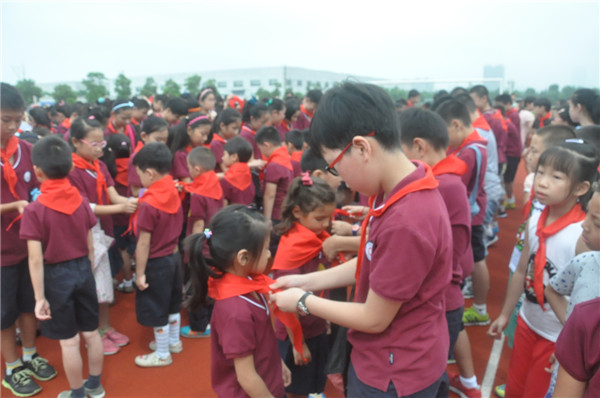仪式开始,一年级的小朋友便收到了入学来的第一份礼物——高年级的学长们亲手制作的书包,小小的书包里饱含着学长们的祝福之意,小小的书包里也交融着清英人团结之心。接着,高年级的学长为小朋友们戴上鲜艳的红领巾,并送上少先队员最神圣的队礼。伴着书包,载着祝福,一年级的新生开启了新的梦想,在清英这片快乐天地里展翅欲翔。