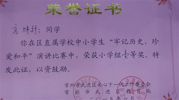 为贯彻落实市关工委、市教育局文件通知精神,清英外国语学校高炜轩同学经踊跃报名,热力参与,在“牢记历史,珍爱和平”演讲比赛活动中荣获一等奖第一名的好成绩。