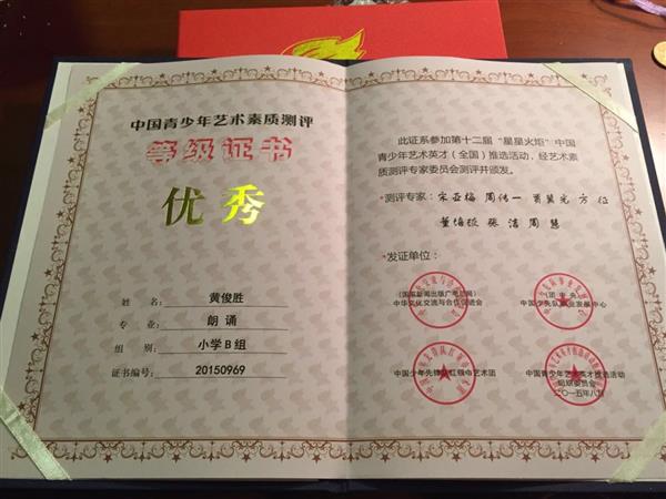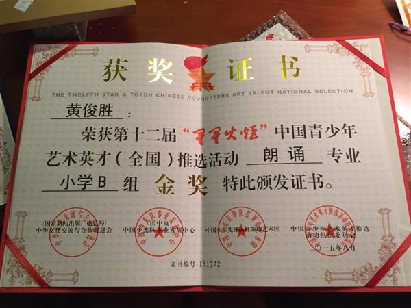 “星星火炬”系列活动是一个全国性的青少年活动,此活动不仅能丰富青少年业余文化生活,还锻炼了青少年舞台表现力,为青少年提供展示自我才能的平台。为丰富暑假生活,8月初,我校黄俊胜同学经过省市级的层层选拔后,代表江苏参加第十二届“星星火炬”中国青少年艺术英才全国总决赛,并获得了朗诵专业小学B组金奖的好成绩!