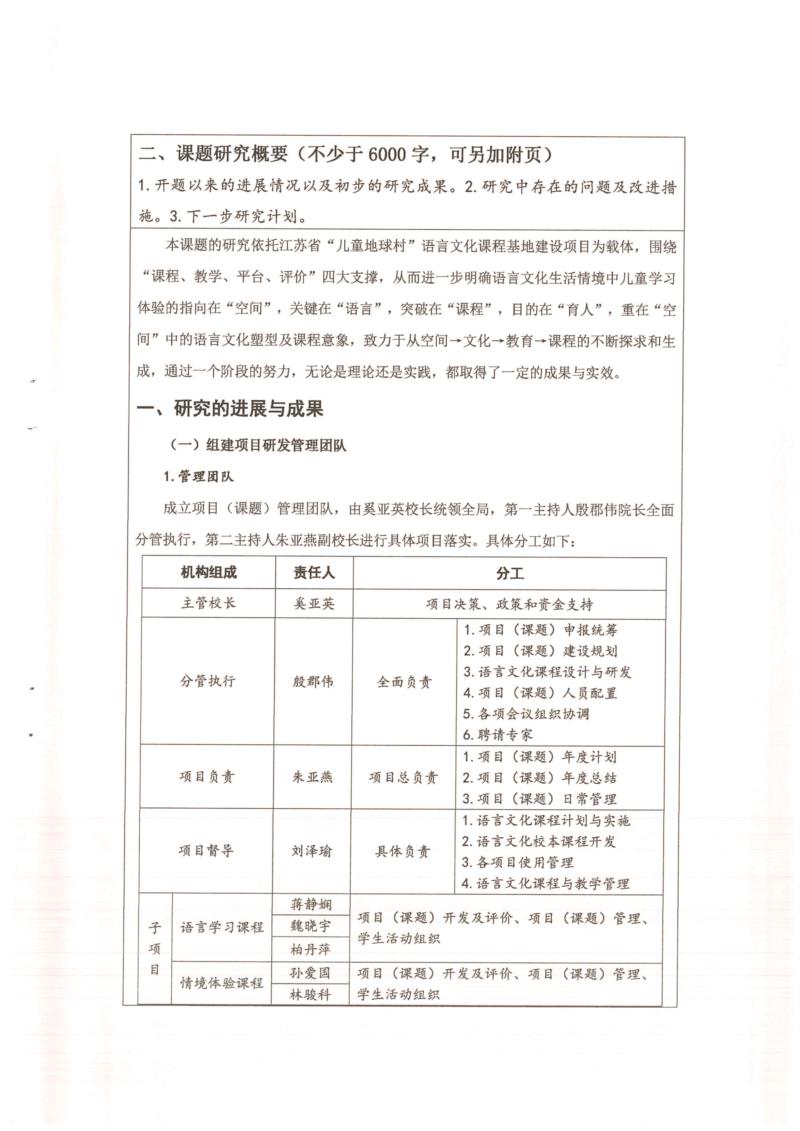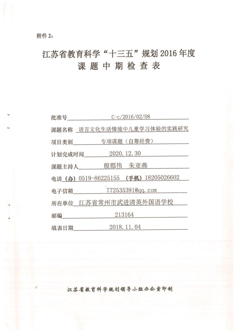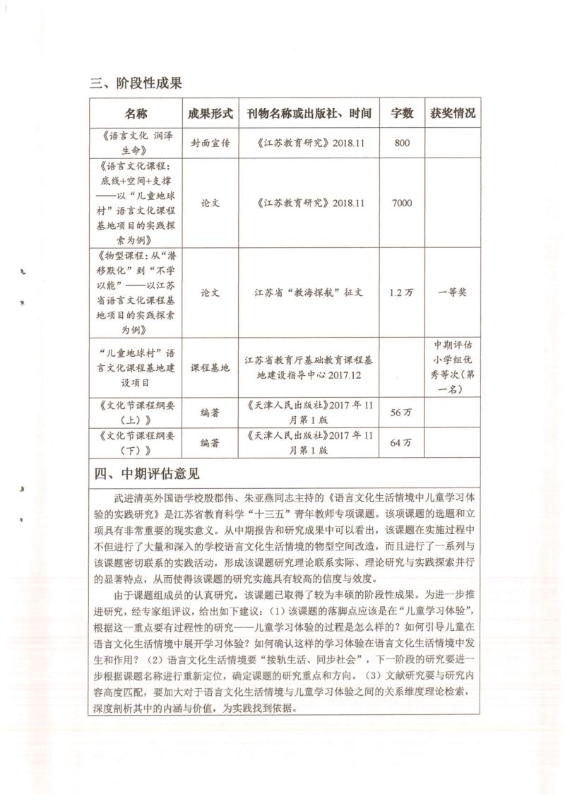 《语言文化生活情境中儿童学习体验的实践研究》中期检查表