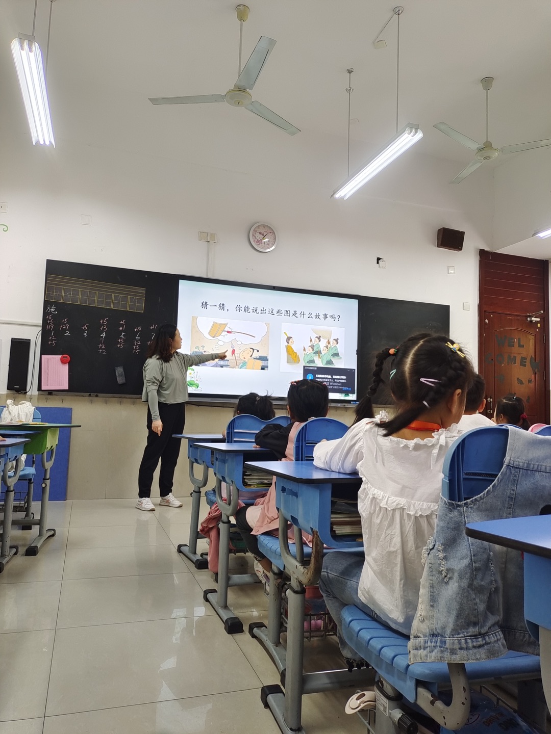 活动中,张兰老师执教了小古文《守株待兔》。课堂上,张老师首先在小古文诵读的语气语调、停顿节奏等方面为孩子们做好明确的方向引导,她通过吟诵、范读、师生合作读、男女生分开读、手势伴读等多种朗读方式,引领孩子们感知小古文语言精练、节奏鲜明、韵律动听、适合朗读的表达特质,帮助孩子们在很短的时间内就学习把握好了朗读的方向和尺度,充分调动了学生的诵读兴趣。紧接着,她又抓住“因释其耒而守株,冀复得兔”这句,特别是“冀复得兔”中的 “冀”字,引导学生思考:农夫放下农具在大树下边等边想,他会怎么想呢?当学生说出来后,出示故事的结局:“兔不可复得,而身为宋国笑”,站在农夫的角度思考自己为什么会被笑,让学生先身临其境地去琢磨这个农夫在想什么,从而轻松引导学生习得故事背后蕴含的道理,环节环环紧扣,层层深人,十分巧妙。