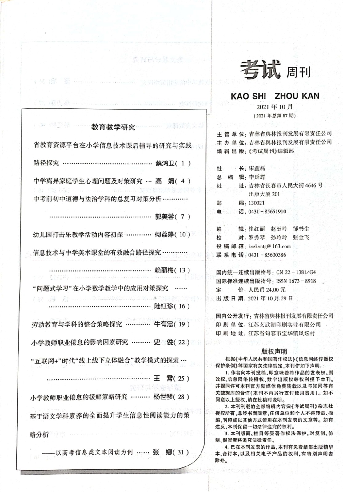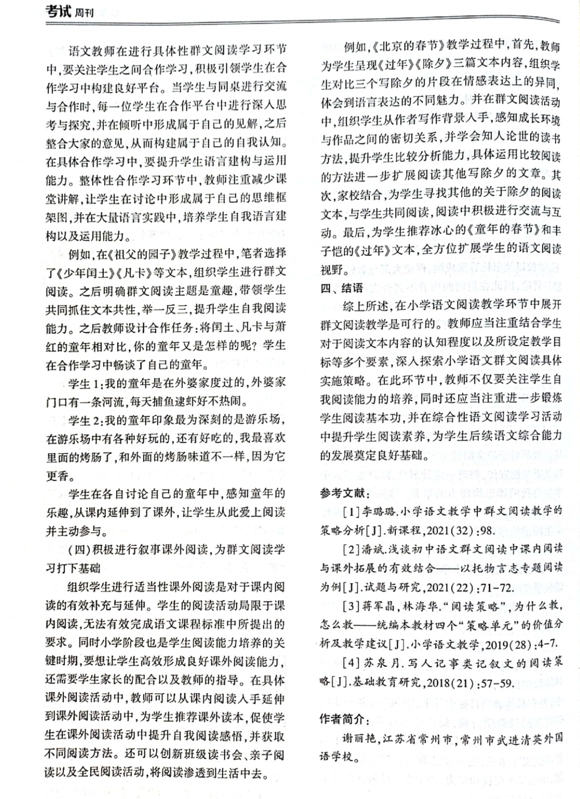 《核心素养背景下小学语文叙事类课文群文阅读教学策略》,作者:谢丽艳 发表刊物:《考试周刊》,发表时间:2021.11