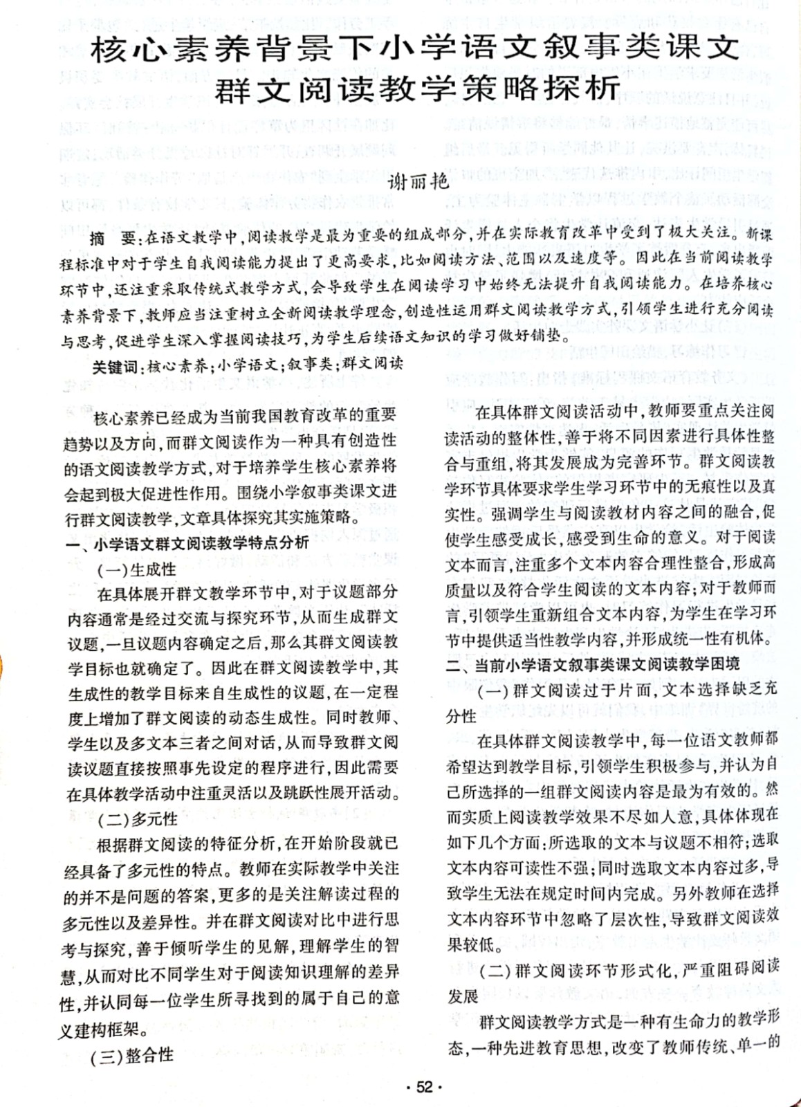 谢丽艳省级论文发表《核心素养背景下小学语文叙事类课文群文阅读教学策略》