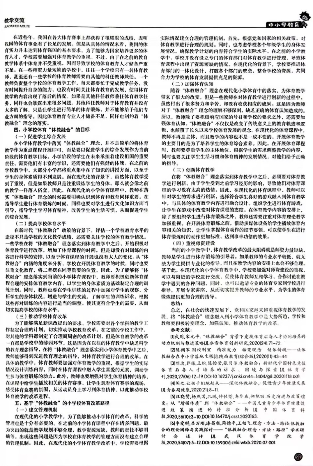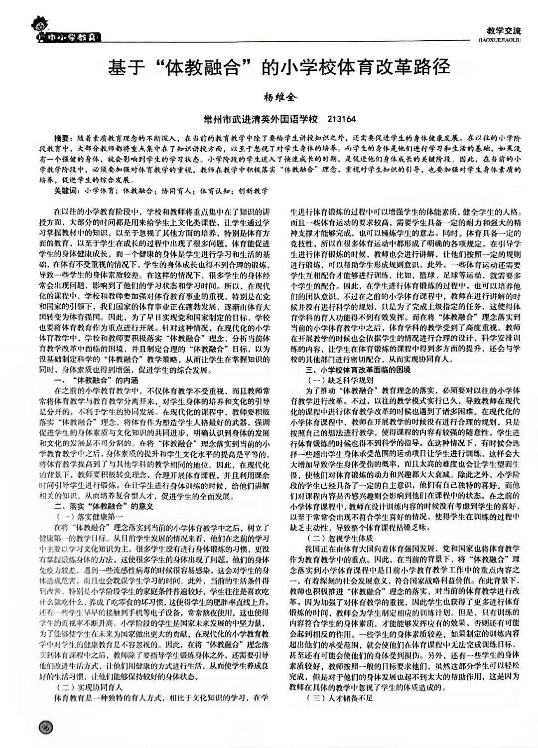 > 新体教融合背景下小学体育课程改革的行动研究