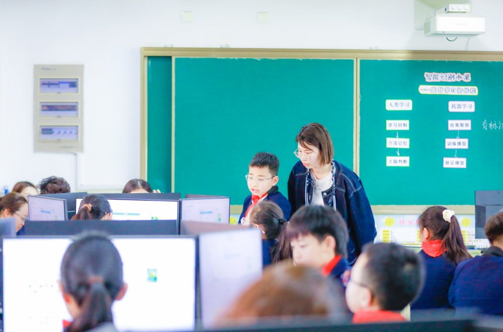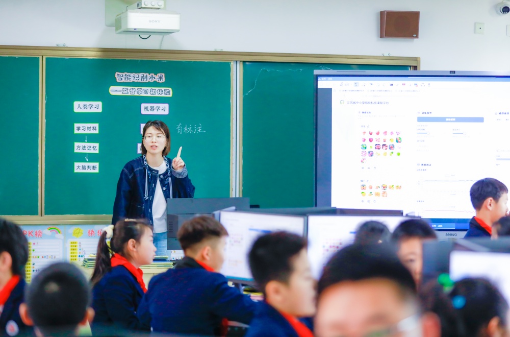 活动伊始,武进清英外国语学校李媛和湖塘桥第二实验小学张静两位老师带来两堂AI通识教育研讨课。李媛老师以《AI奇妙之旅——从图灵测试到恐龙球星》为题,结合常州本土文化与苏超赛事情境,借助趣味互动活动,让学生掌握AI生图技巧,树立AI伦理安全意识。张静老师执教《AI水果识别——机器学习之监督学习体验》,以生活化场景切入,将抽象的监督学习知识拆解为实操步骤,引导学生动手实践,理解AI识别逻辑,提升综合能力。